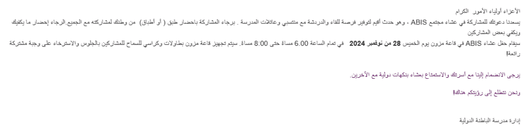 The ABIS Community Dinner will be held in the Mazoon hall on Thursday, November 28, 2024, from 6.00 pm to 8:00 pm. The Mazoon will be set up with tables and chairs to allow participants to sit and relax over a wonderful shared meal!