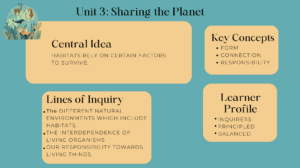 Unit 3 will be introduced to the students next week. I will be attaching the Unit Focus at the bottom of this News Flash. The Transdisciplinary Theme, Sharing the Planet – An inquiry into rights and responsibilities in the struggle to share finite resources with other people and with other living things; communities and the relationships within and between them; access to equal opportunities; peace and conflict resolution. Our Central Idea for Unit 3 is, habitats rely on certain factors to survive.