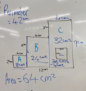 In Mathematics we have been creating clear definitions for perimeter and area of compound shapes. We have been learning rules, calculating missing lengths, finding perimeters of irregular shapes and then using rules to calculate the area of tricky compound shapes (such as below).