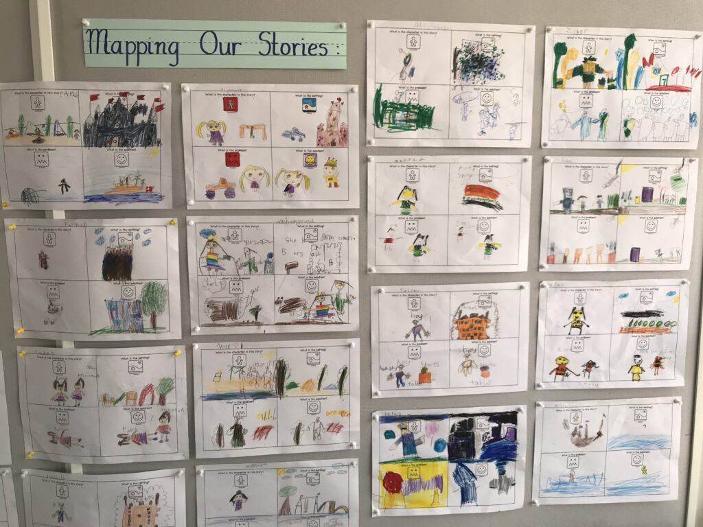 Before writing, they made a story map to think about the character, setting, problem, and solution.