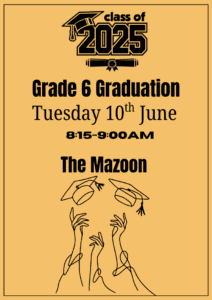 BIGGEST DAY OF THE YEAR – Grade 6 Graduation – TUESDAY 10th June 8.15am – 9am in the Mazoon. This will be a very special event that we really want everyone to attend. It will include a musical performance, memories from Primary school, some Ted Talks, Graduation certificates being given out and lots of awesome memorable moments. So please do whatever you can to ensure that you can attend.