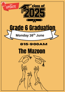 Please remember to be seated for the G6 Graduation by 8.10am on Monday 16th June in the Mazoon. The ceremony will start promptly at 8.15am. Thank you in advance for attending and for trying to make the event special for the students.