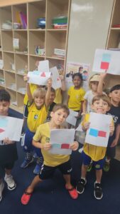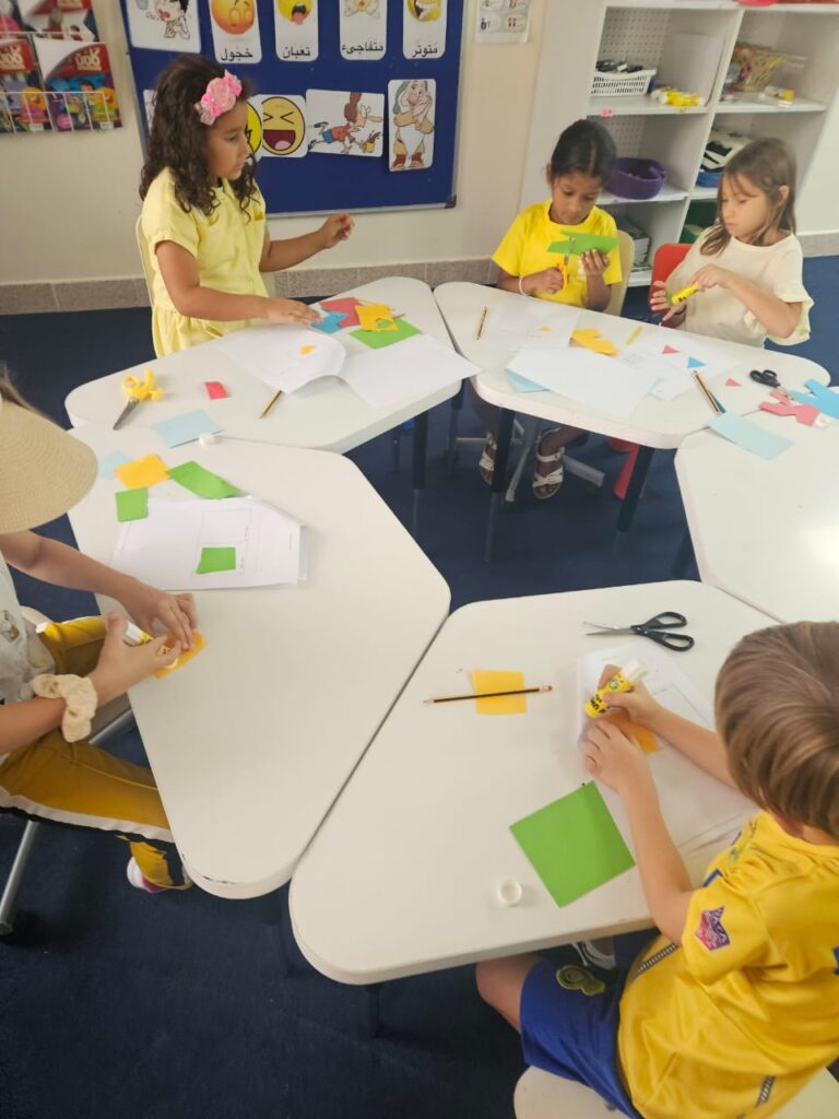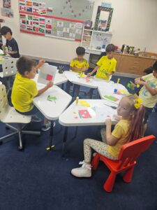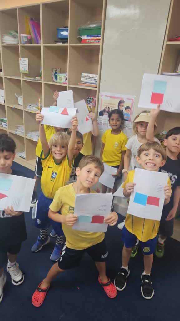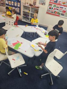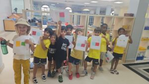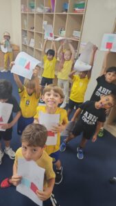 It was a lively activity. We handed out colored sticks, formed teams named after colors, and called out the name of each team. We also played musical chairs using the colors — for example, if we said “red,” the red team would stand up, otherwise they would lose. In addition, we glued and cut some colored worksheets to reinforce the information through hands-on work.
