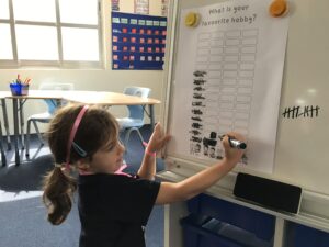In our Unit Who We Are, the children are getting to know each other better by asking questions and recording the answers in charts. They use tally marks and bar graphs, learning to collect, compare, and interpret data in a fun and meaningful way.