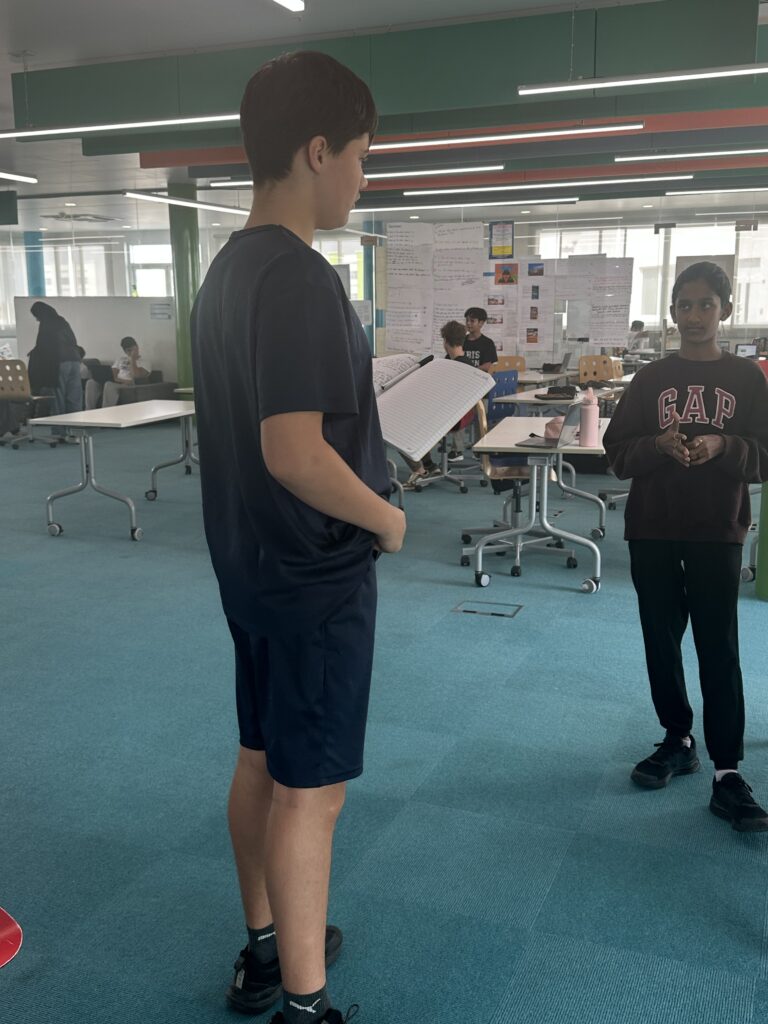 Grade 9 students are working on descriptive travel writing. They started by personifying a city and then they had to transform the description into an evocative monologue performance. It is not easy to stand up in front of one’s peers to perform and some students clearly felt uncomfortable. Yet, they all took on the challenge and delivered a monologue. Now, it is up to them to decide if they want to take the challenge even further and produce a monologue performance for their summative.
