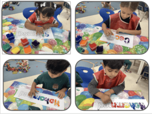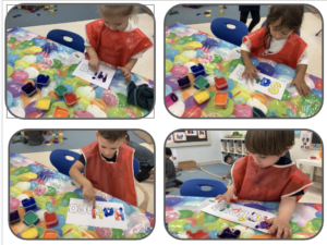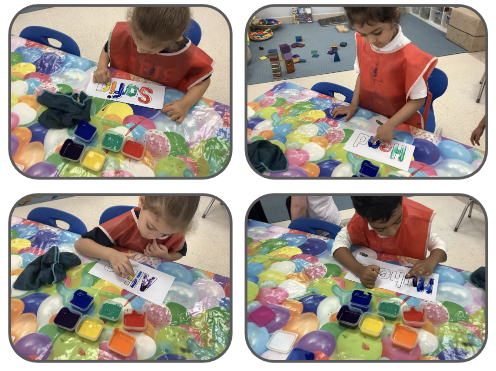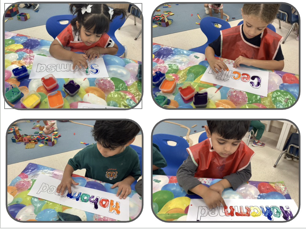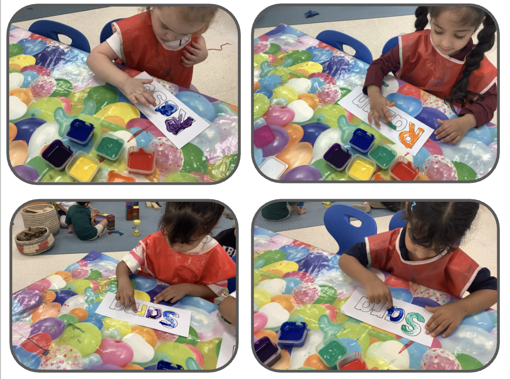 Today’s photographs show the children busy finger-painting their names — hard at work and play! We began the day by looking at a slideshow where each new slide displayed a name. Together, the children tried to work out whose name it might be. If they were unsure, we offered a clue by saying the sound of the first letter, asking, for example, “Whose name begins with the /s/ sound?” Once they guessed, the picture appeared on the screen so they could see if they were correct. Afterwards, the children were invited to find their own name from a selection of two to four names. Once they identified it (with help if needed), they had great fun finger-painting inside the outline of each letter, using a range of bright colours.