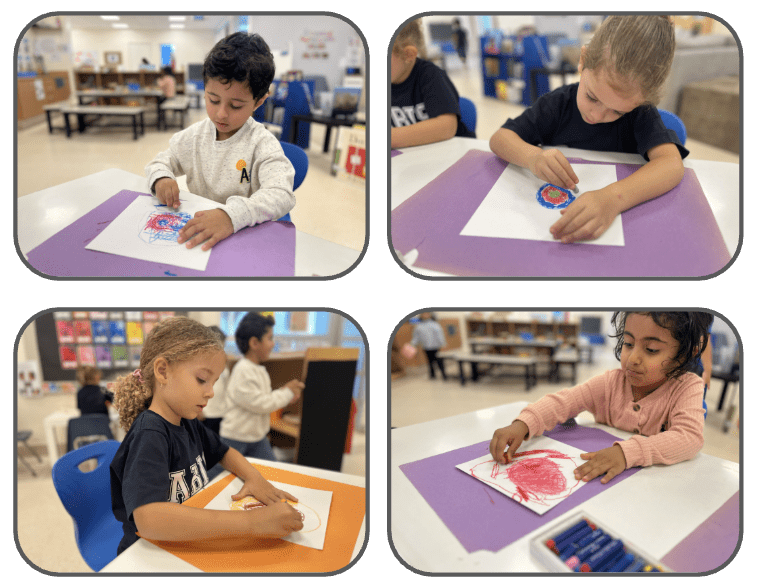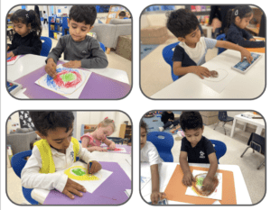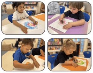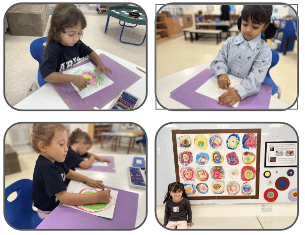 This week, in connection with our unit of inquiry, we introduced the children to the artist Wassily Kandinsky. Kandinsky was one of the pioneers of abstract art and believed that colours and shapes could be used to express emotions and inner feelings. We began by looking at a photograph and a portrait of the artist himself, before exploring two examples of his early, more representational work. We then showed the children a couple of his later paintings, which were abstract and full of bold colours and shapes. We focused on one painting in particular—Color Study with Concentric Circles. Although now very well known, this artwork was originally created as a colour study in which Kandinsky experimented with different colour combinations. The children were then invited to create their own versions of this piece. Today, we revisited some of Kandinsky’s work and, using everyday objects such as cups and pieces of card to print with, the children began to create their own Kandinsky-inspired abstract paintings containing circles and straight lines. We will continue with the printing next week! You can see some of this beautiful artwork in our classroom. The photographs below show the children working on their own ‘concentric circles’ artwork.