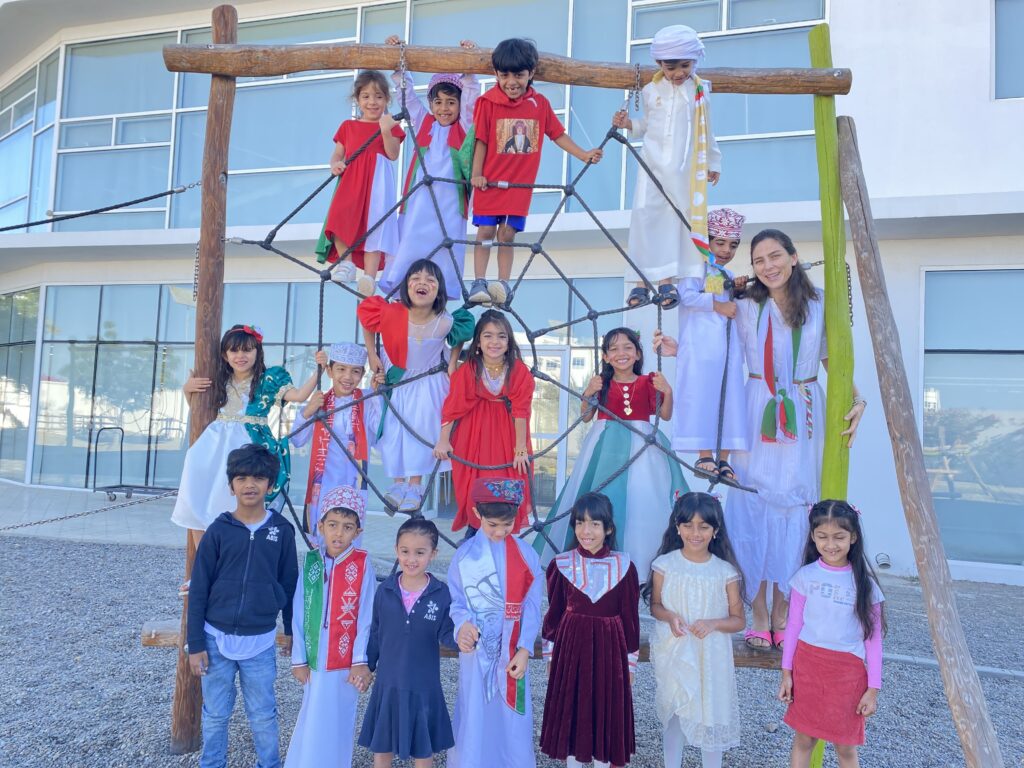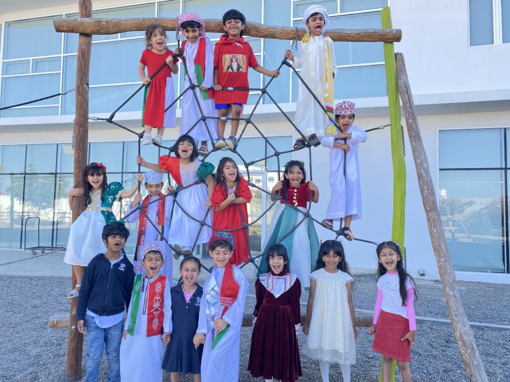 Today, we celebrated Omani International Day at school. The children wore beautiful, colorful dresses and traditional clothes. The school looked very festive.