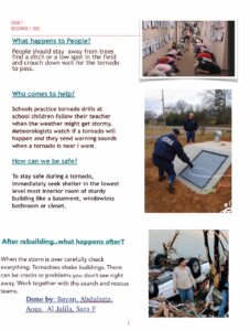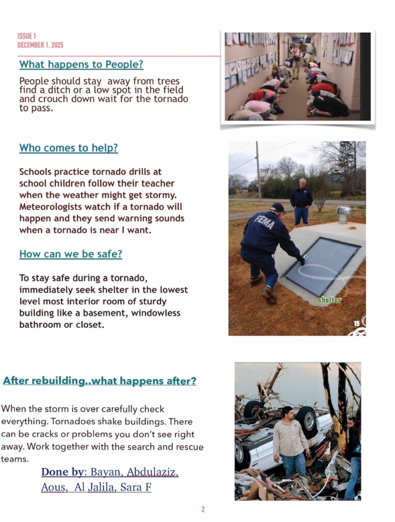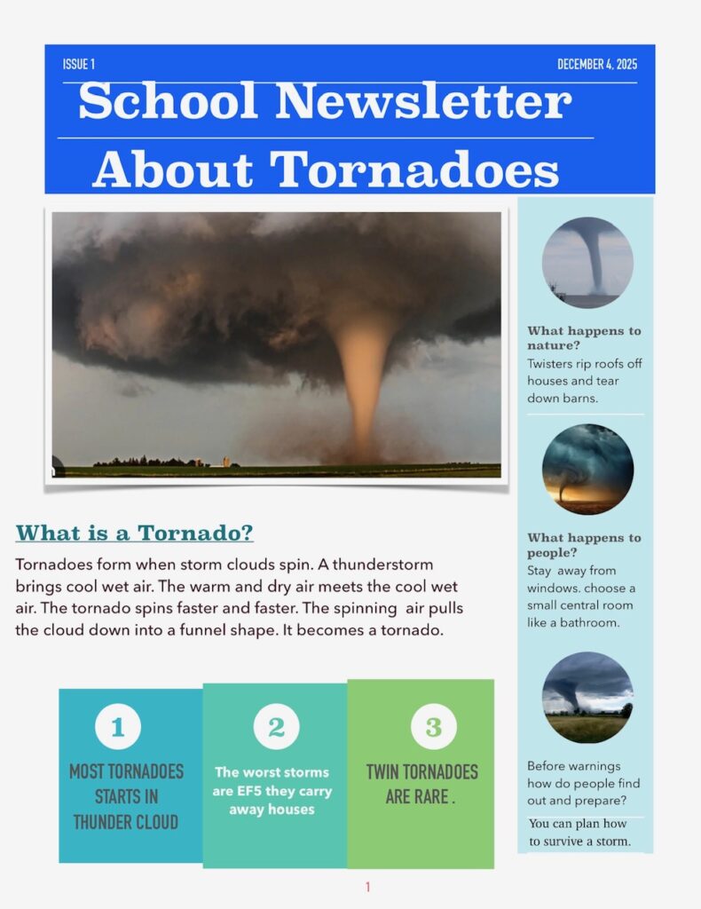 Grade 3 Take Action! by Roshell WILLIS | Dec 4, 2025 | Grade 3, The Grades | 0 comments Hello Everyone, Grade 3 students are learning about extreme weather and decided to write a newsletter providing information about tornados and how to stay safe.