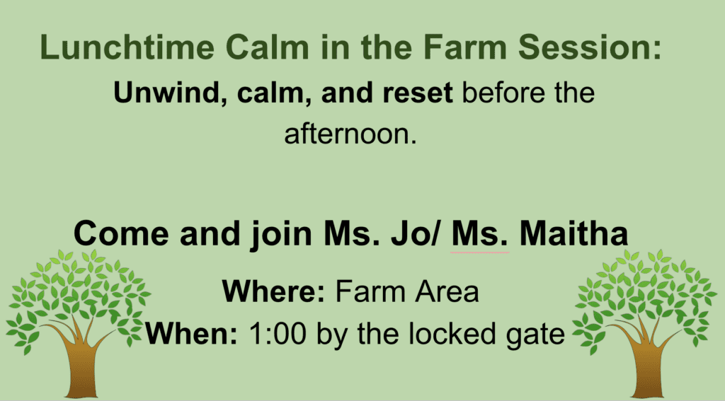 For PYP students, some of the SHINE team have been setting up a well-being project called ‘Calm in the Farm.’ We are so lucky to have this beautiful campus and to be able to utilise the farm space. We will be working with students on calming and regulation strategies before they go back to class after lunch. We will also be offering sessions to staff…