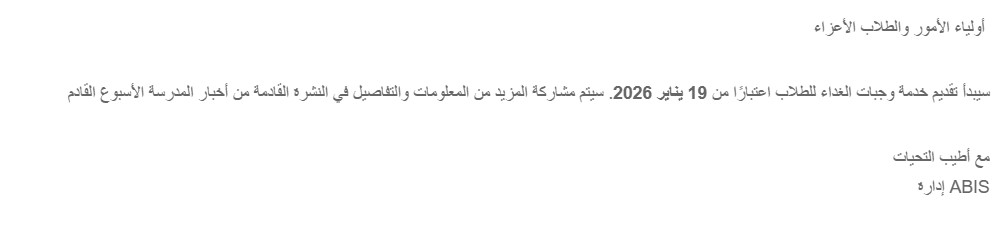 ABIS Student Lunch Service to Start on 19 January 2026 by Alaa ALKMALY | Jan 8, 2026 | News Flash | 0 comments Dear parents, The student lunch service will commence on January 19, 2026. Further information and details will be shared in the next Newsflash update, scheduled for release next week. Kind Regards, ABIS Administration