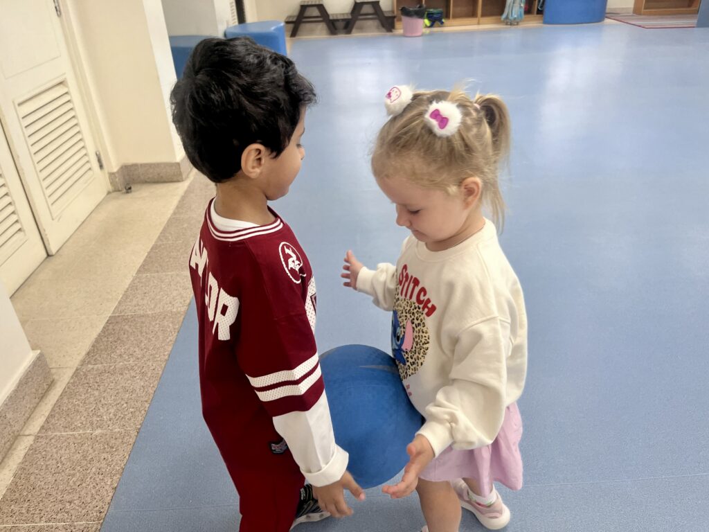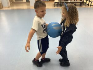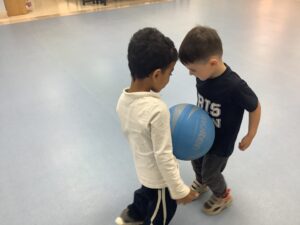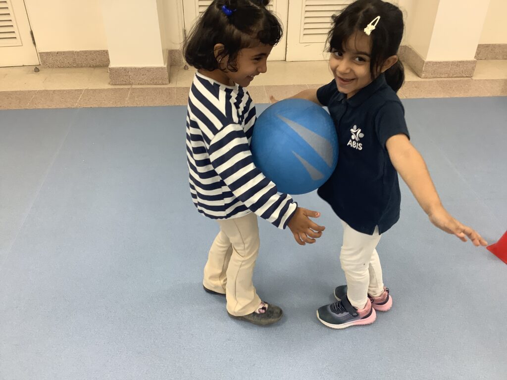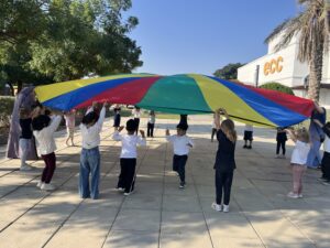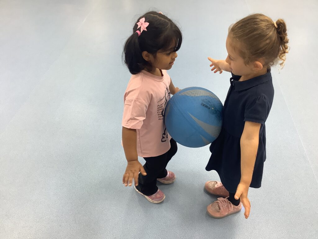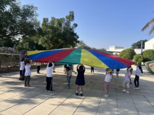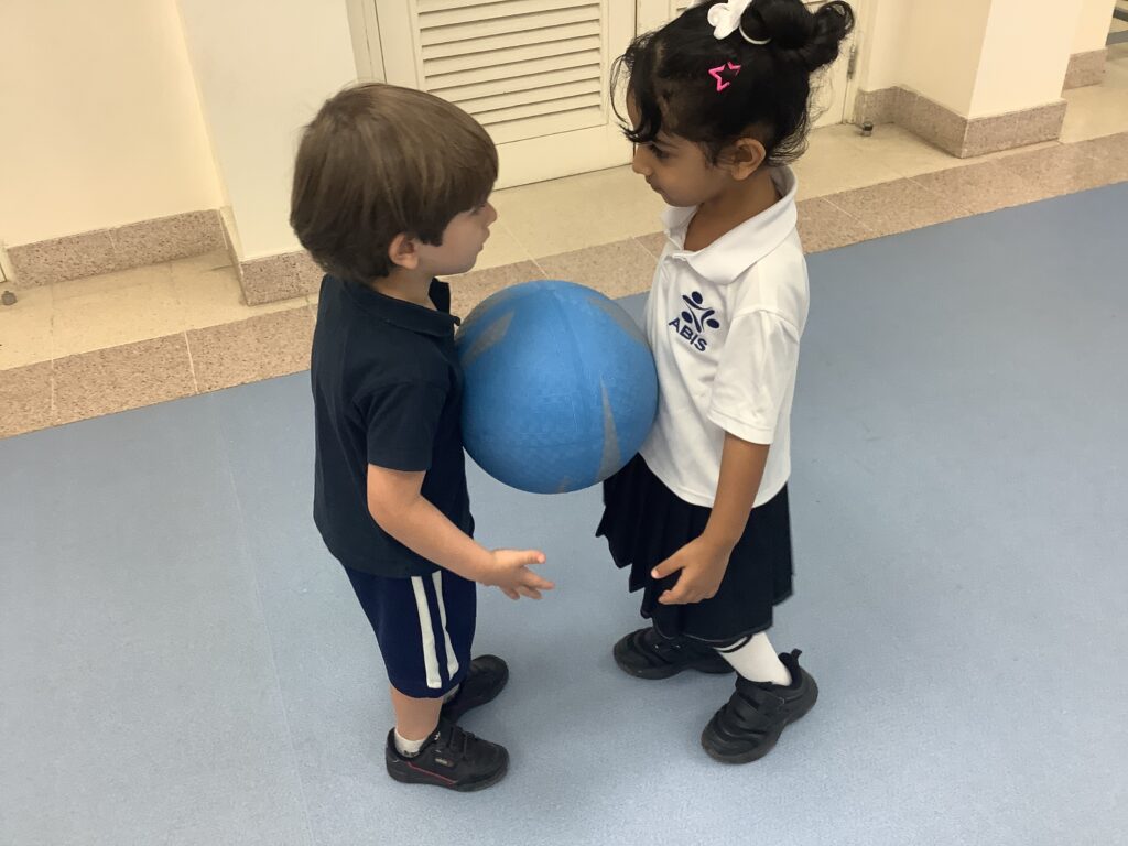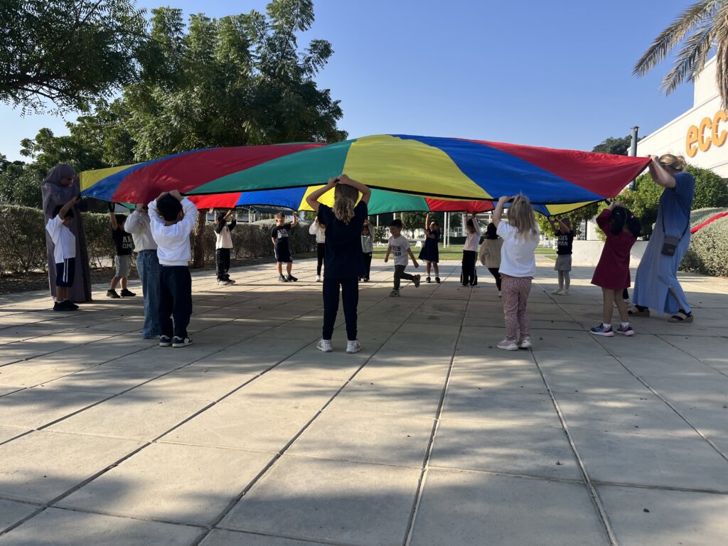 After an extended time apart, it is always good to refocus our attention on our sense of class community. Throughout the week, time was set aside to revisit ideas from our first (and ongoing) unit of inquiry, Who We Are, around working and playing together, including teamwork, collaboration and concepts of kindness. We began this focus with a fun activity on Sunday. After reading The Squirrels Who Squabbled by Rachel Bright—a story in which the main characters learn that sharing and working together often leads to greater success, and more enjoyment—the children were invited to take part in a collaborative challenge. Working in pairs, they were asked to move a large ball from one cone to another without using their hands. Instead, they had to keep the ball balanced between them and coordinate their movements to prevent it from falling. The activity prompted plenty of laughter and provided a meaningful opportunity for the children to practise cooperation and communication. You can see photographs of the children busily engaged in this game below. Later in the week the children were excited to be given the chance to work together as a whole class in order to play fun parachute games.