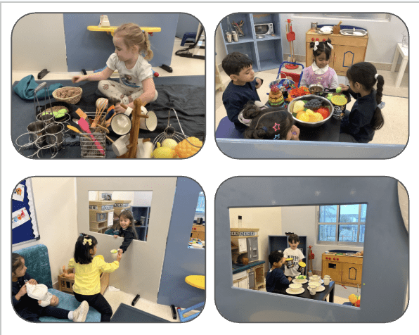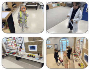 When engaging in role play, children make sense of the world around them by exploring familiar experiences and social roles. They practise communication and language skills as they negotiate roles, share ideas, and use new vocabulary, while also developing social and emotional skills such as cooperation, empathy, turn-taking, and confidence. While exploring both independent and collaborative role play, children plan, problem-solve, and connect ideas, using a wide range of resources creatively to represent their thinking and experiences. The photographs below show children engaged in role play scenarios they created themselves, including police, doctor, home settings, birthday parties, teachers and students, restaurants, hair salons and shops.