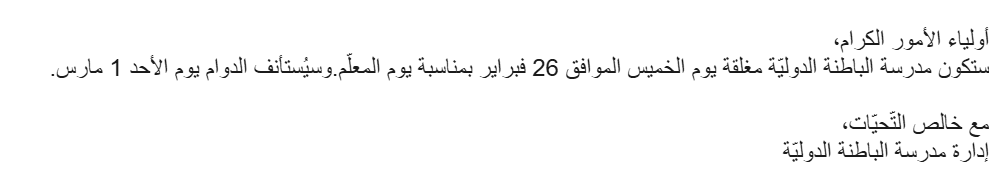 ABIS will be closed for Teacher’s Day. School will resume on March 1 by Alaa ALKMALY | Feb 23, 2026 | News Flash | 0 comments Dear parents, ABIS will be closed on Thursday, February 26, for Teacher’s Day. School will resume on Sunday, March 1. Kind regards, ABIS Administration