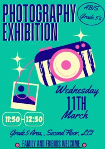We are excited to invite families to our upcoming Grade 5 Photography Exhibition, which will take place on Wednesday 11th March at 11:50am. This exhibition is the culmination of our current Unit of Inquiry under the theme How We Express Ourselves, where students have been exploring how digital technology can help us communicate ideas about the world.